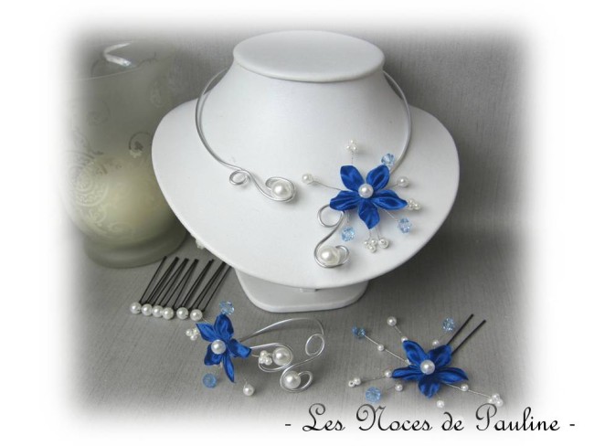 Parure bleu Ciel et blanc à fleurs de satin composée des éléments suivants: