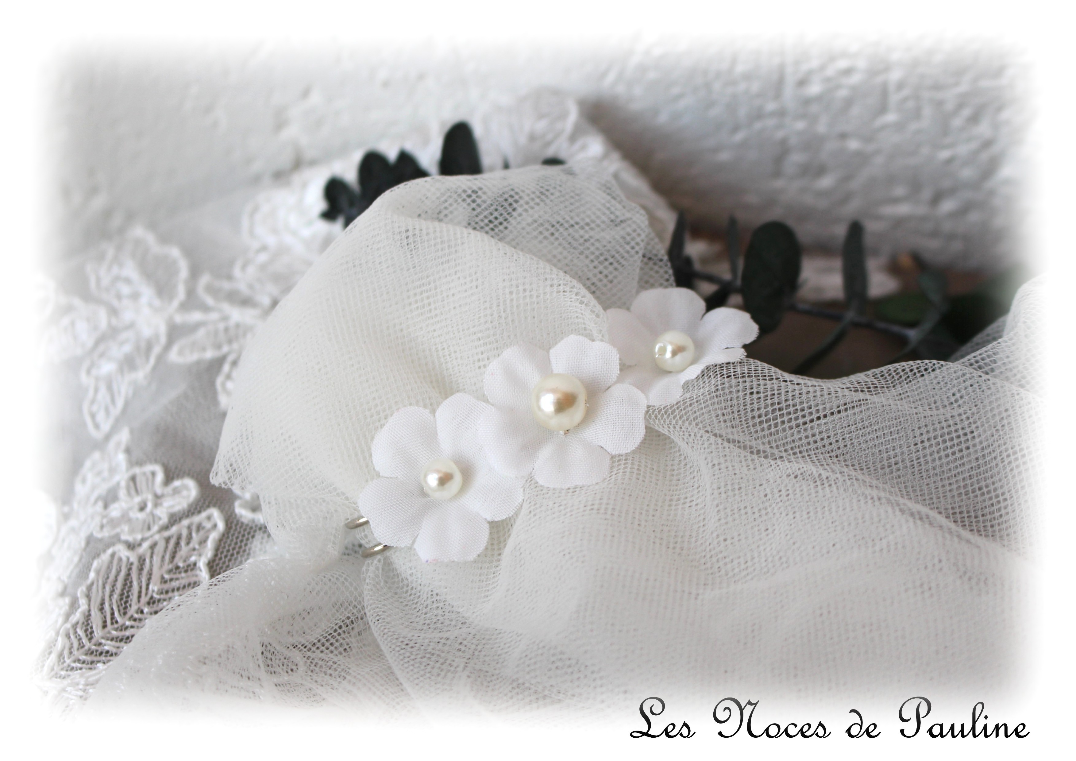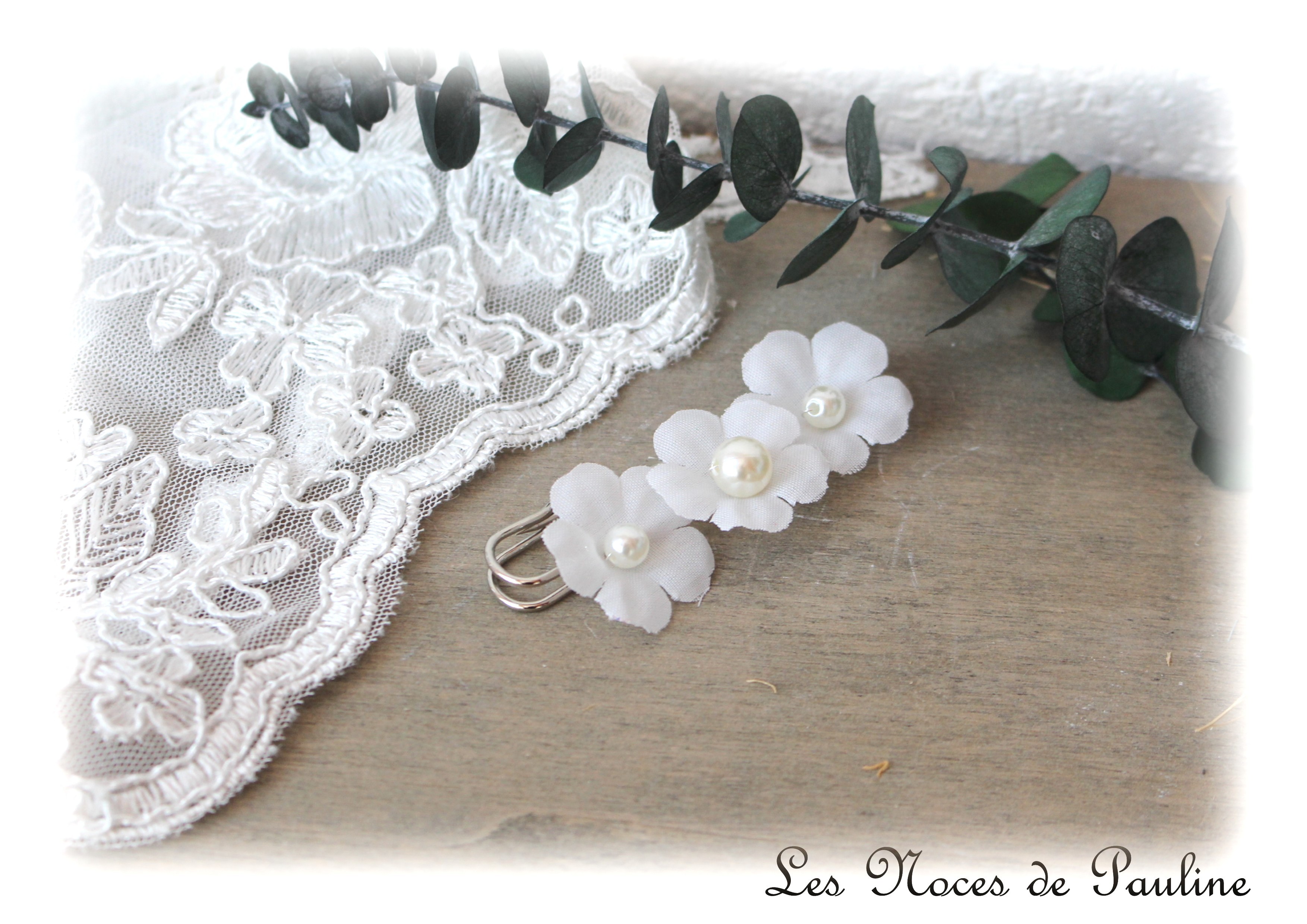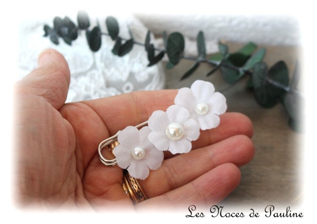 Broche / attache traîne réalisée à partir d’une base argentée et agrémentée de trois fleurs blanc poudré agrémentées de perles nacrées.