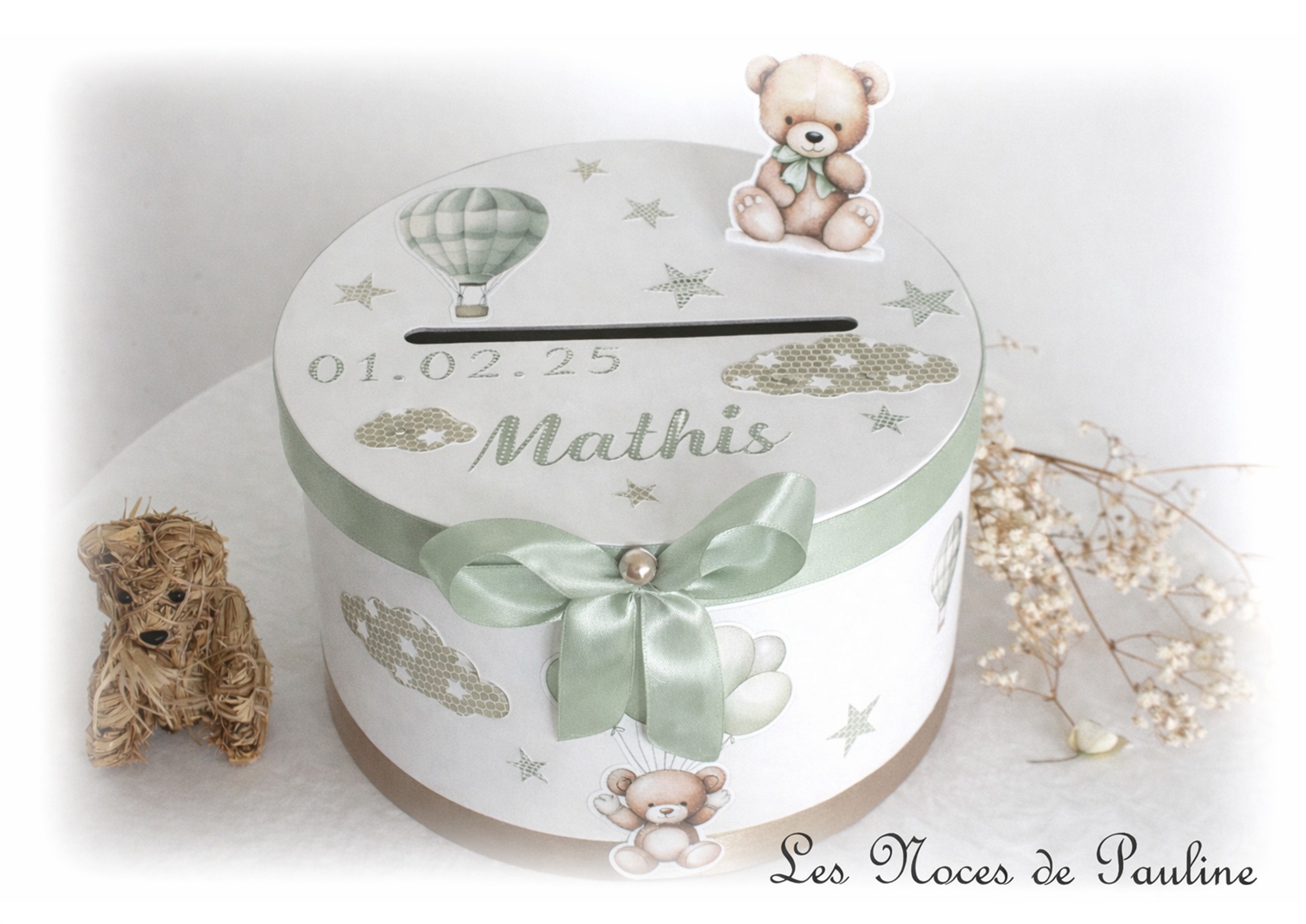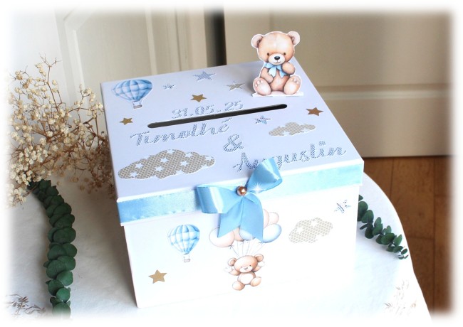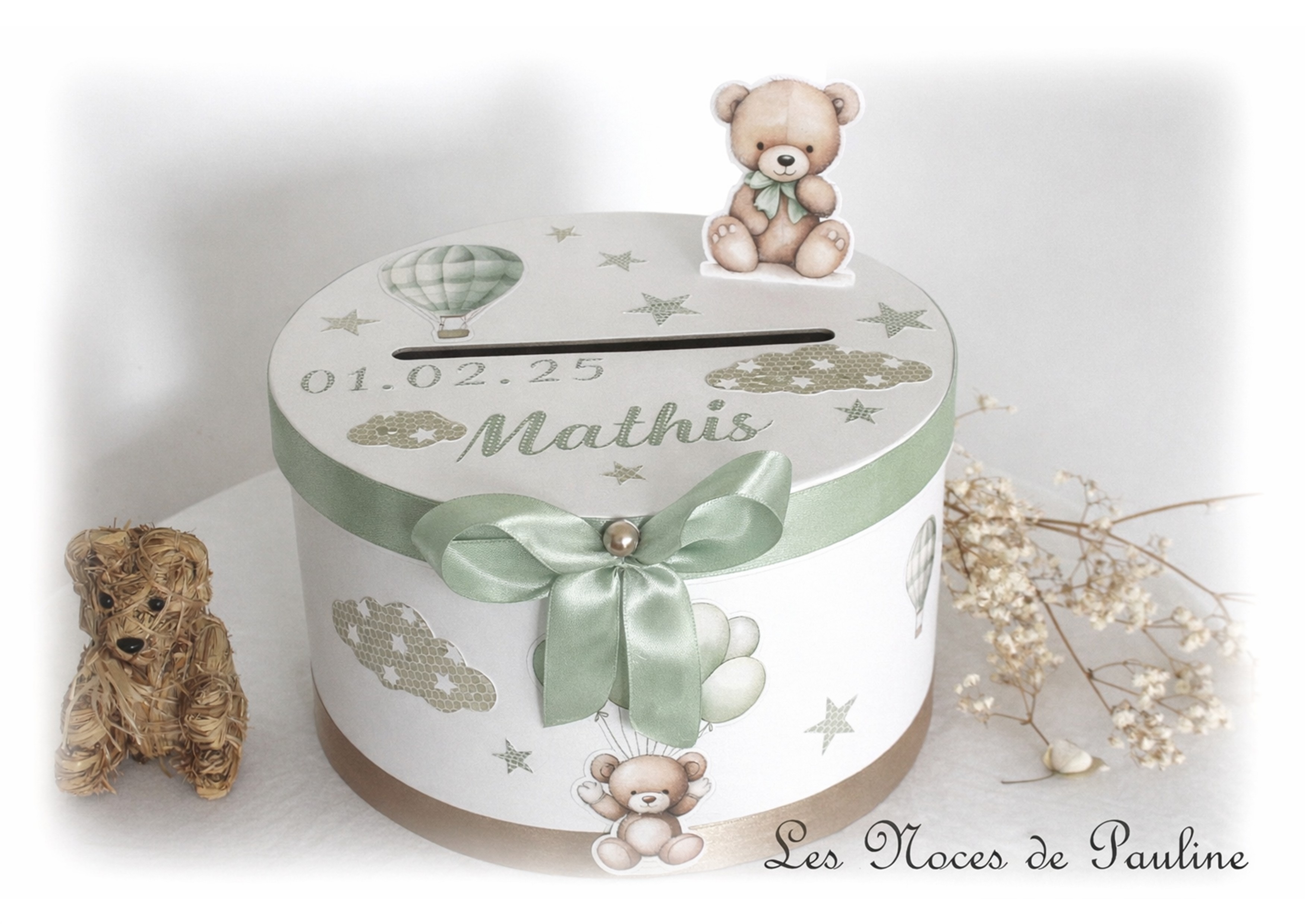 Urne réalisée sur-mesure sur le thème ourson et montgolfière dans une jolie harmonie de couleurs toutes douces de bruns et de vert Sauge.