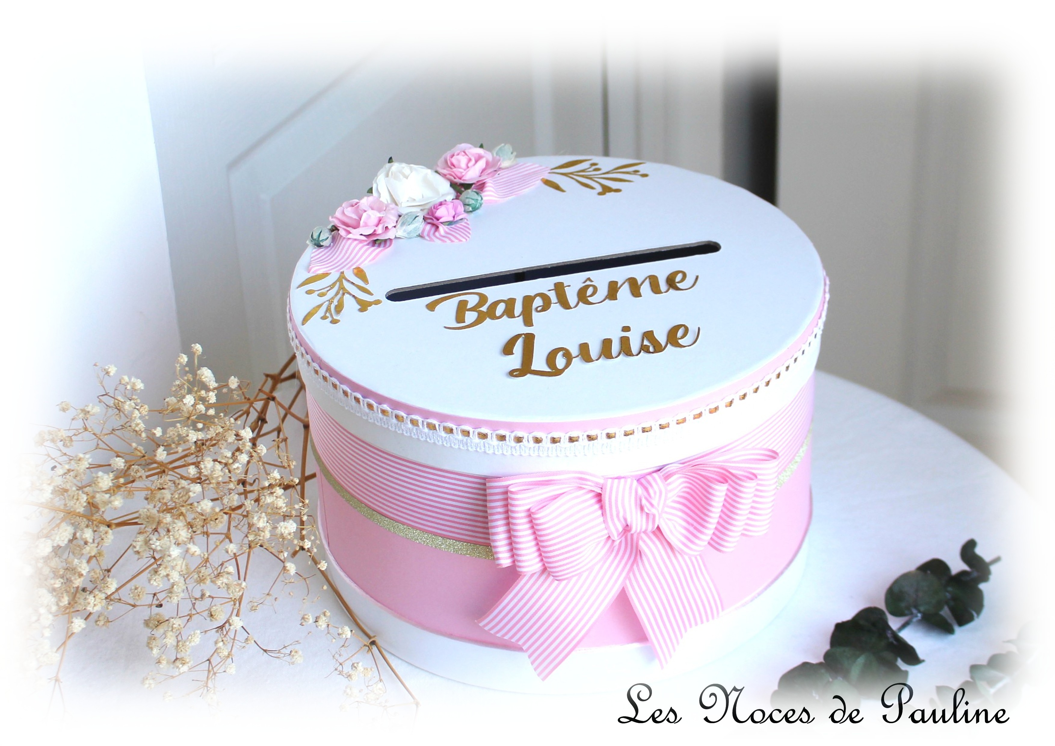 Urne réalisée sur-mesure dans une délicate harmonie toute en douceur de rose Dragée, vert Eucalyptus et de doré.