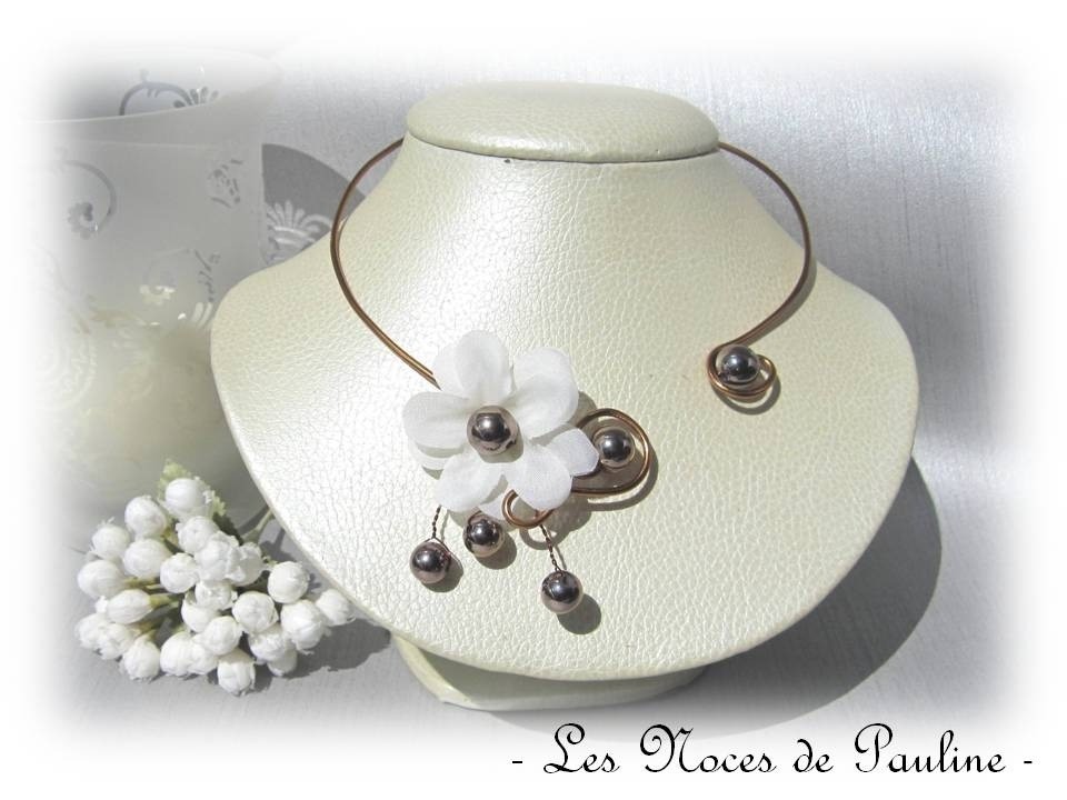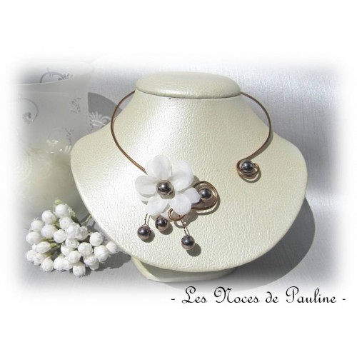 Bracelet blanc et marron Chocolat réalisé en fil d'aluminium de la collection 'Les volutes' à l'esprit printanier avec sa délicate petite fleur de cerisier...