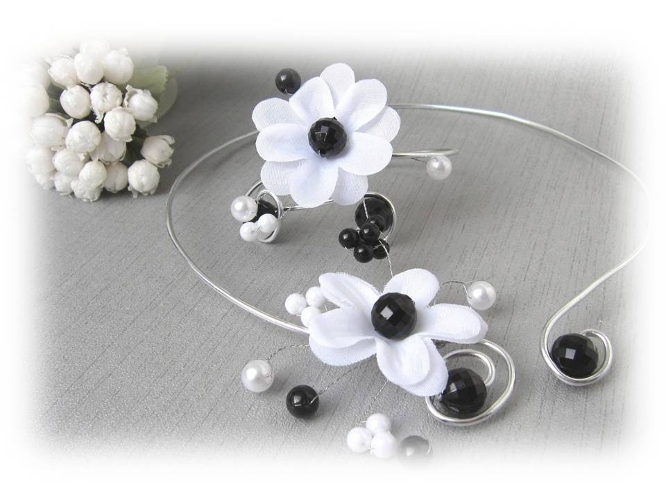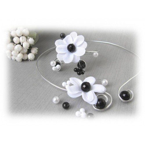Bracelet noir et blanc réalisé en fil d'aluminium de la collection 'Les volutes' à l'esprit très printanier avec sa délicate petite fleur blanc Neige.
