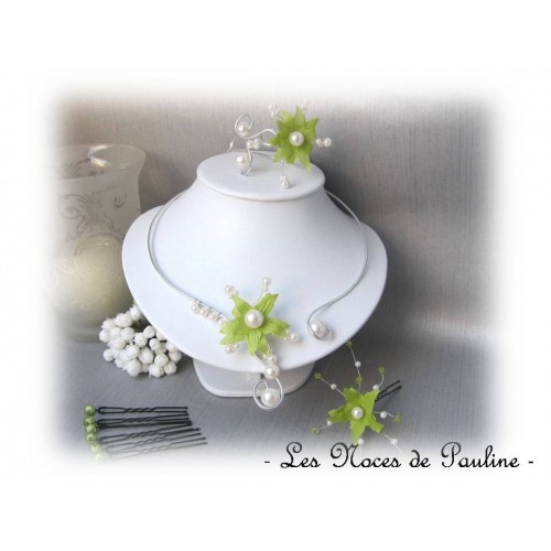 Bracelet vert Mousse et blanc nacré réalisé en fil d'aluminium de la collection 'Les volutes' à l'esprit très printanier avec sa délicate petite fleur...