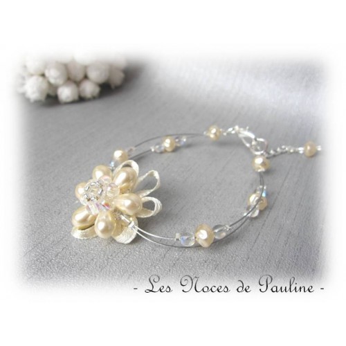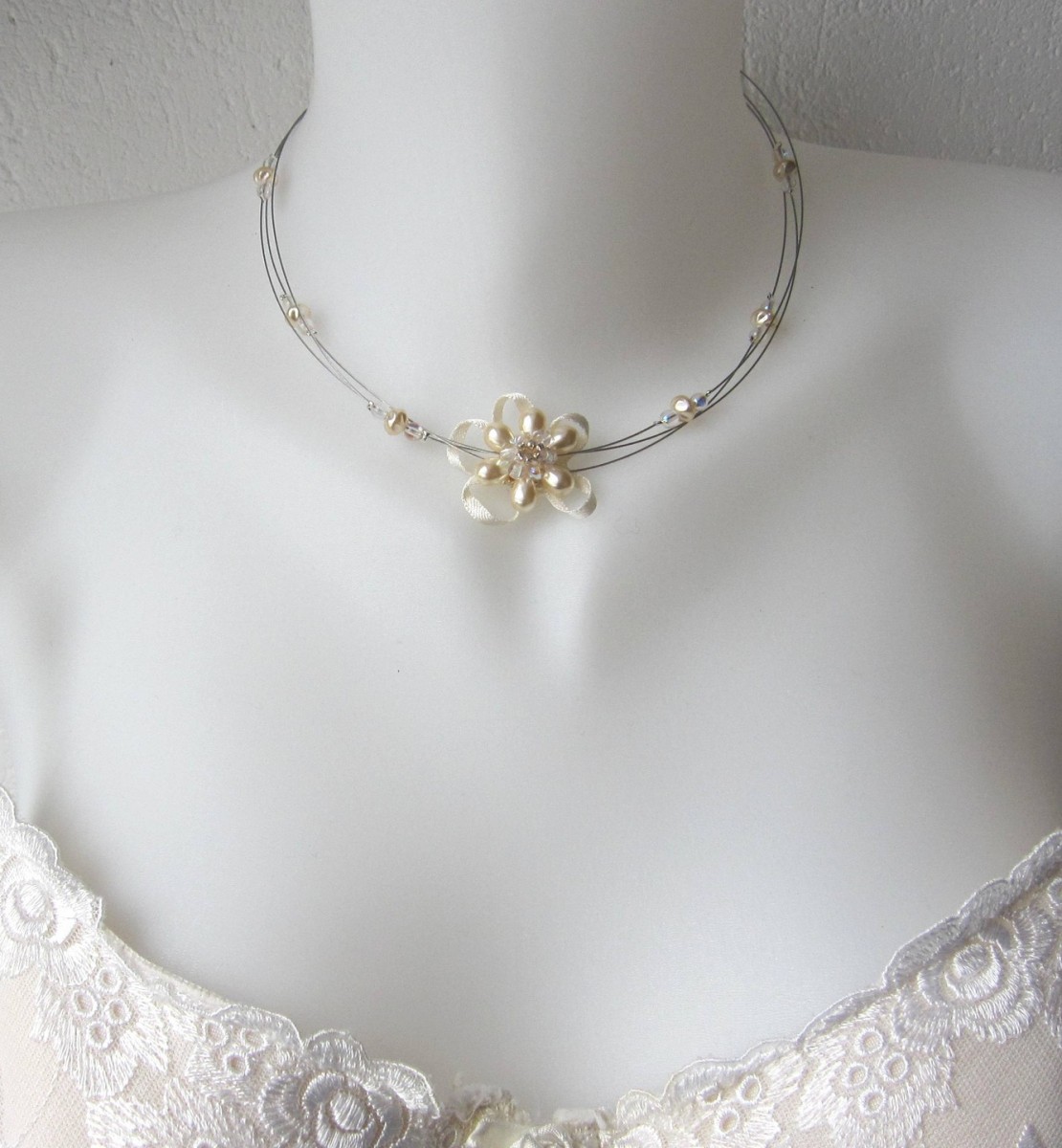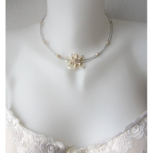 - un collier de mariage monté sur trois rangs de fil câblé agrémentés de perles blanc nacré et irisé en verre et d'une fleur "fait-maison' en gouttes Ivoire la collection 'tradition' à l'esprit intemporel. Un délicat ruban de satin assorti est délicatement travaillé autour de la perle centrale pour la mettre en valeur.