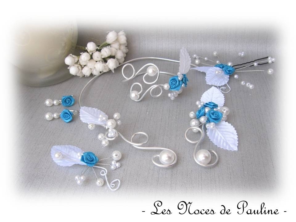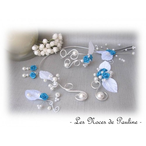 Pic à chignon de mariage composé de délicates roses turquoise et leurs deux feuilles blanc Neige agrémentée de délicates branches en perles nacrées.