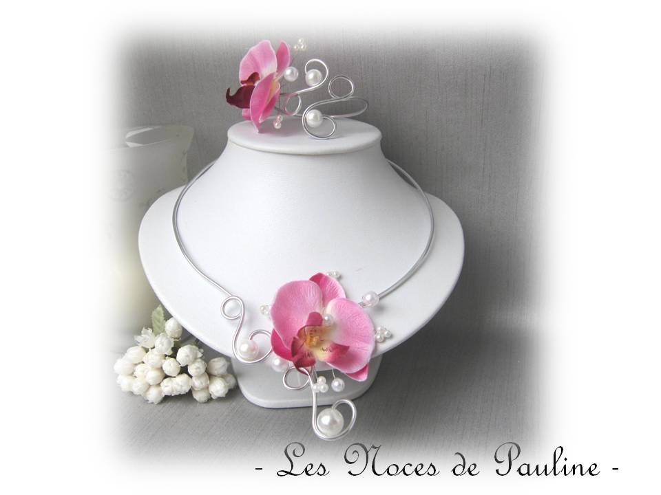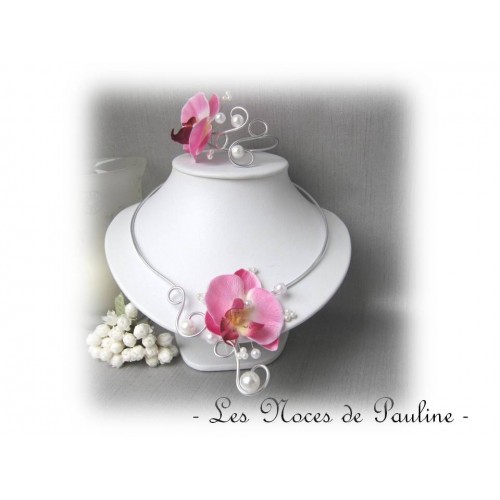 Bracelet rose Fuchsia et blanc Neige réalisé en fil d'aluminium argent de la collection 'Les volutes' à l'esprit très printanier avec sa délicate fleur d'Orchidée agrémentée de perles blanc nacré...