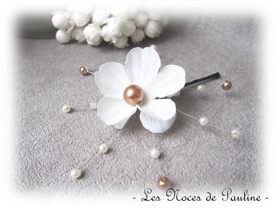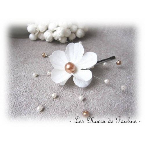 Barrette à cheveux composée d'une fleur de Printemps Ivoire agrémentée de pistils en perles ivoire nacré et d'un c?ur en perle marron nacré.
