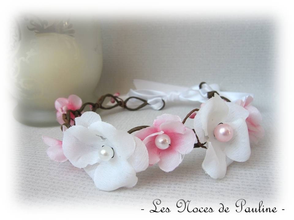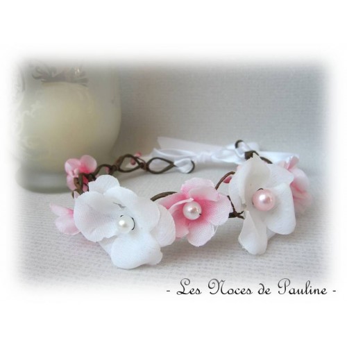 Couronne de fleurs, pour les mariages et cortèges, composée de délicates fleurs blanc neige et rose Dragée au c?ur orné de perles blanc nacré et de délicates baies disposées sur une base très naturelle rappelant celle de branchages.