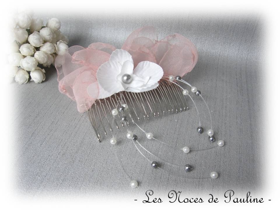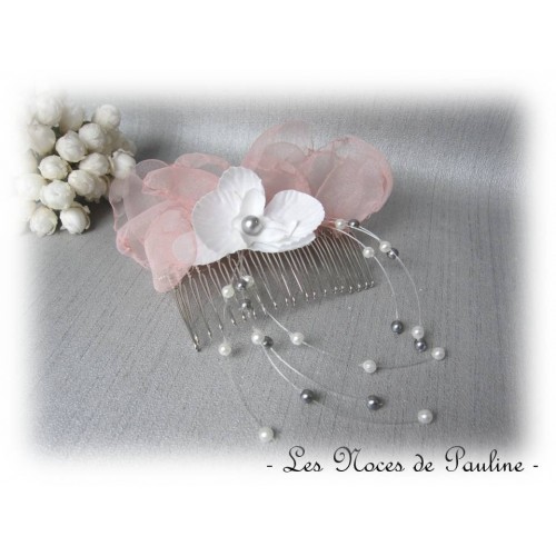 Boucles d'oreille réalisées à partir de splendides perles en cristal blanc irisé et de perles nacrées rose Clair et gris Nuage, montées sur des crochets de couleur argent et agrémentées de délicates calottes filigranées, de la collection 'tradition' à l'esprit intemporel.