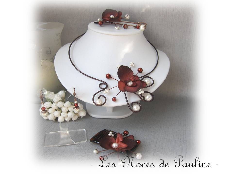 Broche / attache-traîne réalisée à partir d'une fleur d'orchidée marron Chocolat agrémentée de perles nacrées ivoire et marron délicatement dispersées autour de la fleur et en pendants.