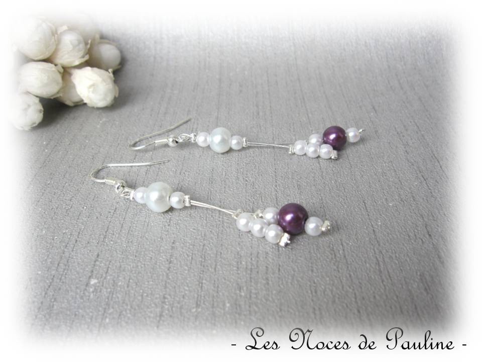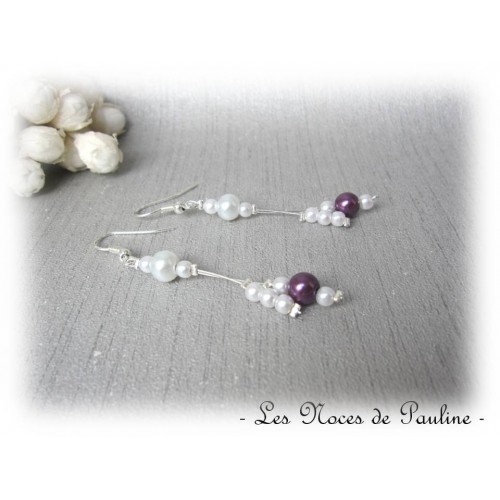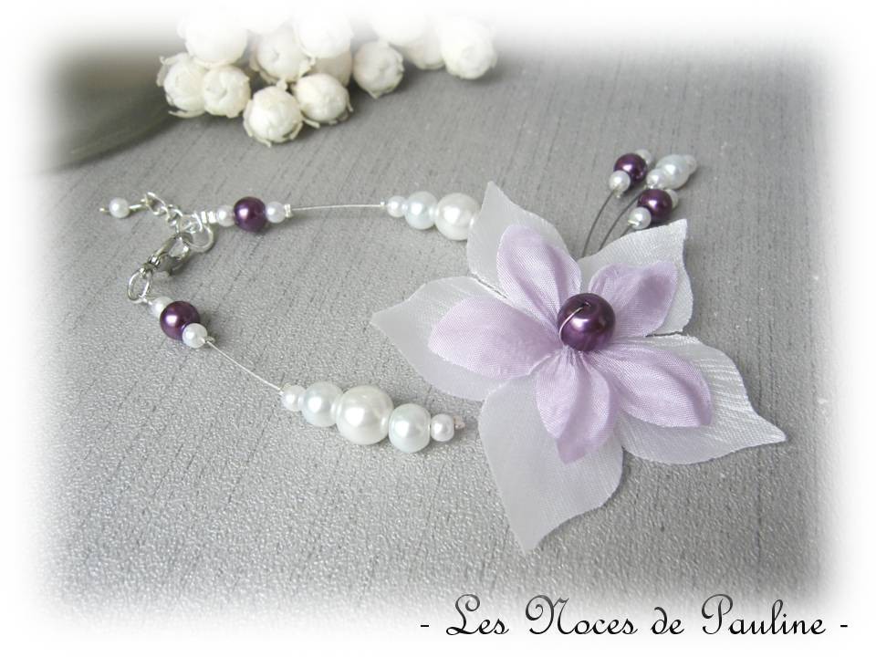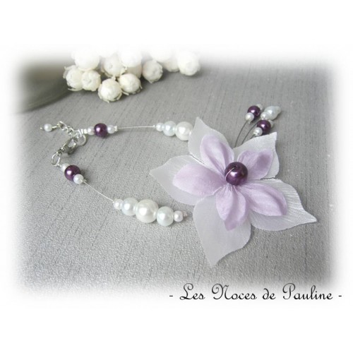 - un collier réalisé à partir de délicates perles nacrées blanc neige et violet subtilement posées sur un rang de fil câblé et agrémenté de deux fleurs de satin assorties posées de manière asymétriques.