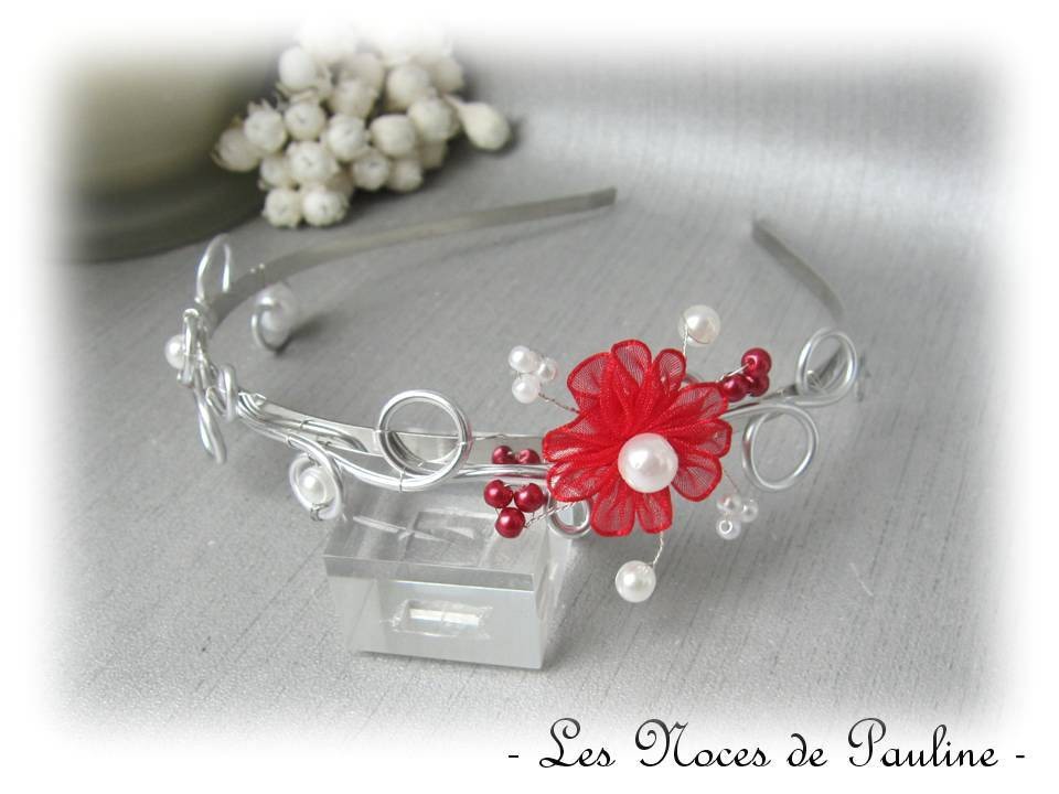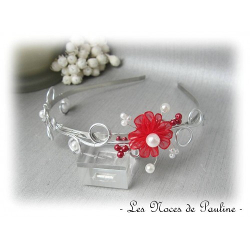 Bracelet sur fil métallique argent à l'esprit très raffiné composé d'une fleur centrale en organza rouge Passion et agrémentée de belles perles nacrées montées en petits picots pour un esprit végétal.