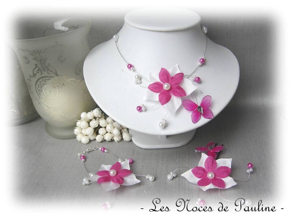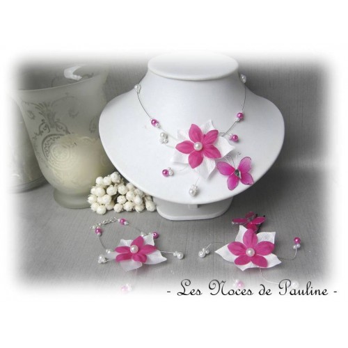 Pic à chignon de mariage rose Fuchsia et blanc Neige composée d'une fleur à double pétales de soie et en satin agrémentée de délicats branchages perlés et d'un ravissant papillon en organza.