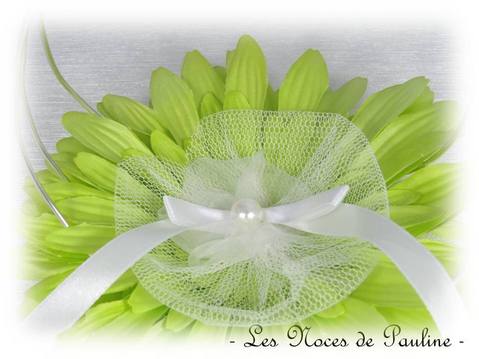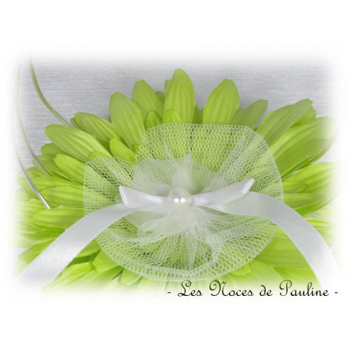 Ce porte-alliances est créé à partir d'une flamboyante fleur vert anis décorée d'un c?ur en voile délicat, d'un n?ud en satin et d'une perle nacrée. L'ensemble est posé sur trois anneaux en aluminium couleur Champagne dont les extrémités sont habillées de belles perles.