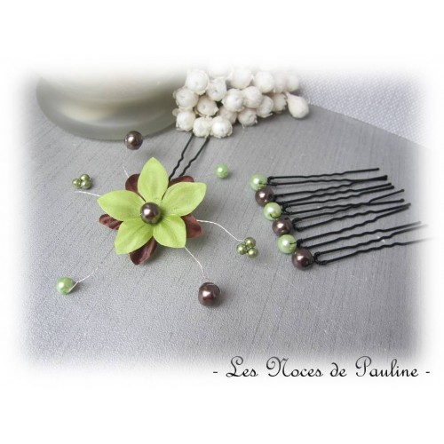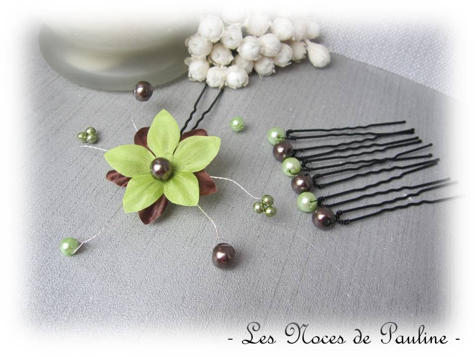 Parure de mariage vert Anis et marron en fleurs de soie composée des dix éléments suivants: