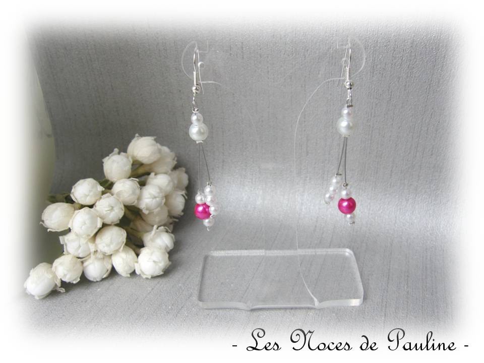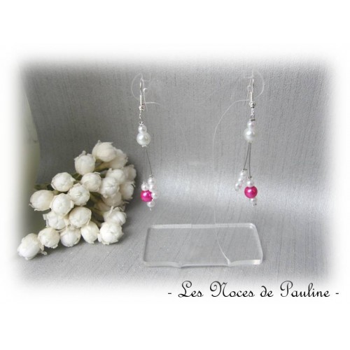 - un collier réalisé à partir de délicates perles nacrées blanc neige et rose Fuchsia subtilement posées sur un rang de fil câblé et agrémenté de deux fleurs de satin assorties posées de manière asymétriques.