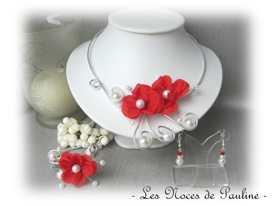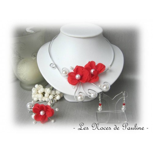 Collier rouge et blanc nacré réalisé en fil d'aluminium de la collection 'Les volutes' à l'esprit très printanier avec ses flamboyantes fleurs rouges...