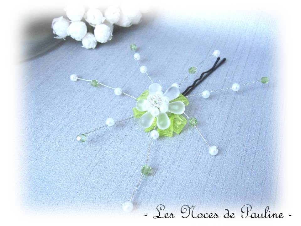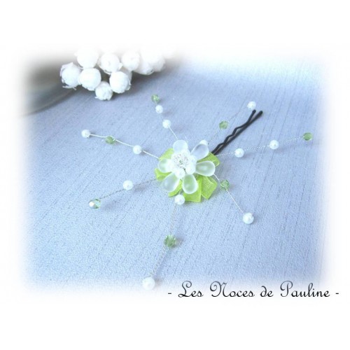 Collier de mariage monté sur trois rangs de fil câblé agrémentés de perles de verre de Bohême vert anis et de perles blanc nacré et d'une fleur "fait-maison' en gouttes blanc dépoli la collection 'tradition' à l'esprit intemporel. Un délicat ruban en mousseline d'organza assorti est délicatement travaillé autour de la perle centrale pour la mettre en valeur.
