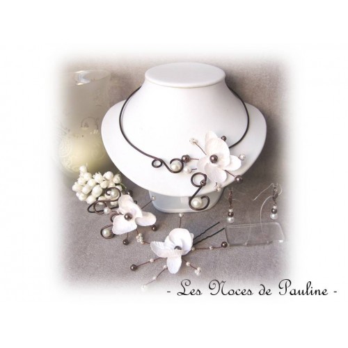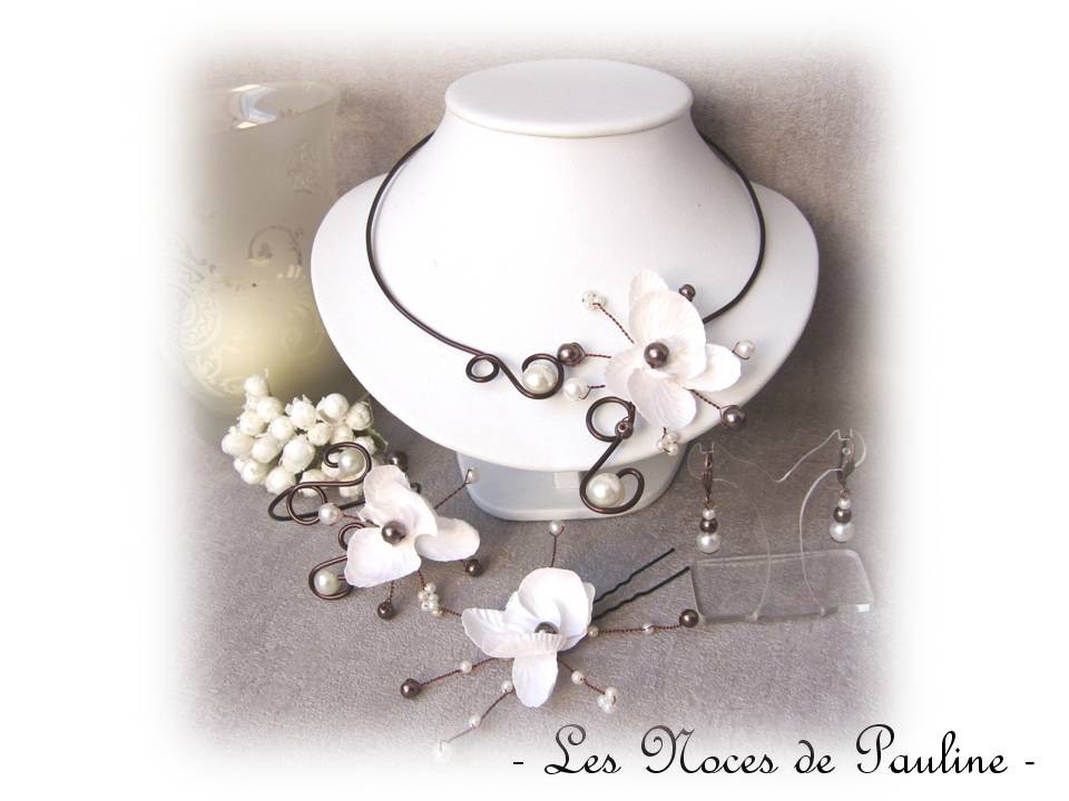 Pic à chignon de mariage composé d'une flamboyante fleur d'Orchidée ivoire agrémentée de délicates branches en perles nacrées ivoire et marron Chocolat.