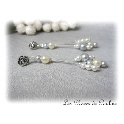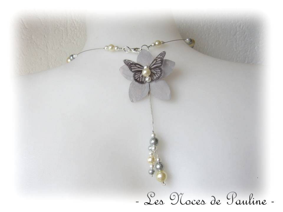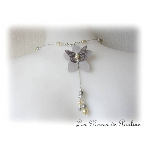 - un collier réalisé à partir de délicates perles nacrées Ivoire, jaune clair et gris Nuage subtilement posées sur un rang de fil câblé et agrémentées de deux fleurs (une orchidée et une en soie) posées de manière asymétriques. Un délicat papillon apporte tout son charme à l'une des fleurs sur laquelle il est posé...