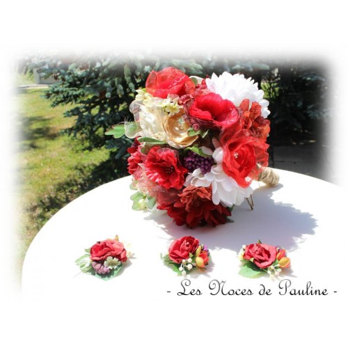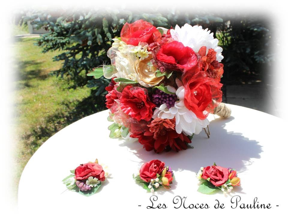 Boutonnière sur-mesure réalisée à partir de fleurs rouge Passion , agrémentées de baies et de petits branchages, de feuilles , le tout assemblé sur une épingle discrète.