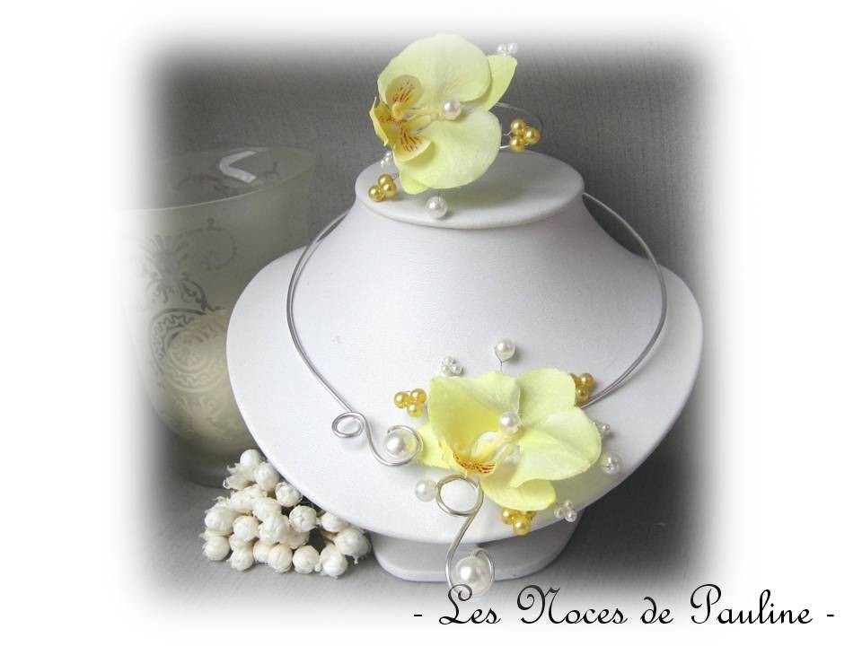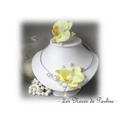 Collier jaune Poussin et blanc Neige réalisé en fil d'aluminium argenté de la collection 'Les volutes' à l'esprit très raffiné avec sa délicate fleur d'Orchidée Grand Modèle agrémentée de perles nacrées assorties...