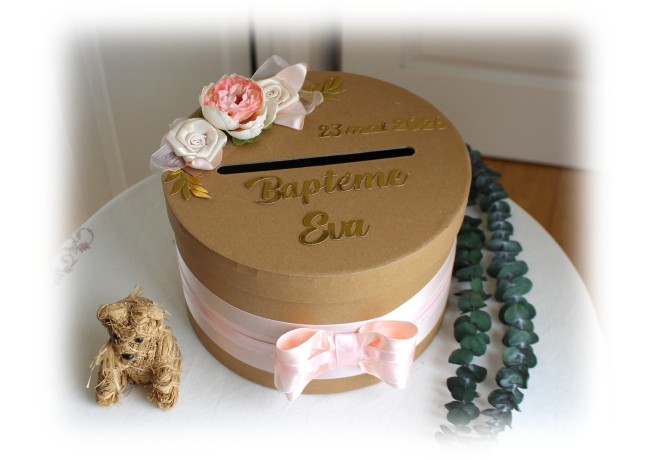 Sur-mesure, Urne de baptême rose à fleurs, urne Personnalisée Thème Princesse