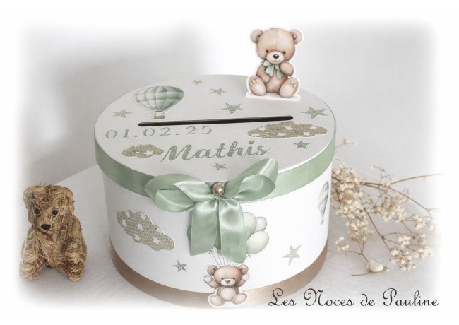 Urne de baptême ourson montgolfière vert et beige, urne personnalisée, urne à enveloppes