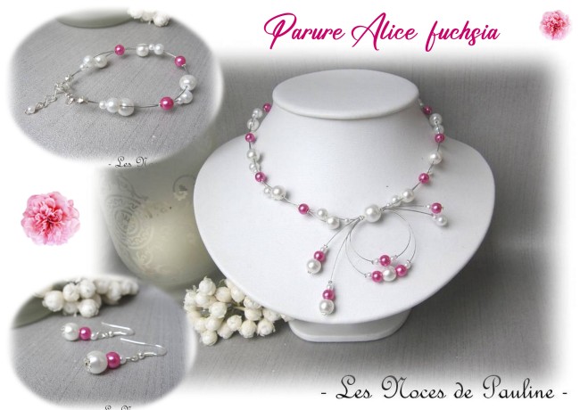 Parure mariage rose Fuchsia et blanc en perles Alice, bijoux mariage rouge 3 Pièces